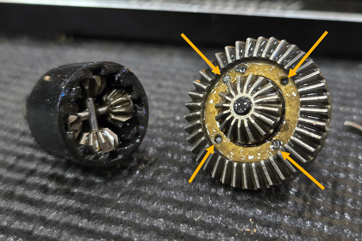 Whether you hit a wall at high speed, or don't quite land that big air backflip onto concrete, if the shock towers take serious impacts, the gearbox will eventually break, and most likely in the manner shown.