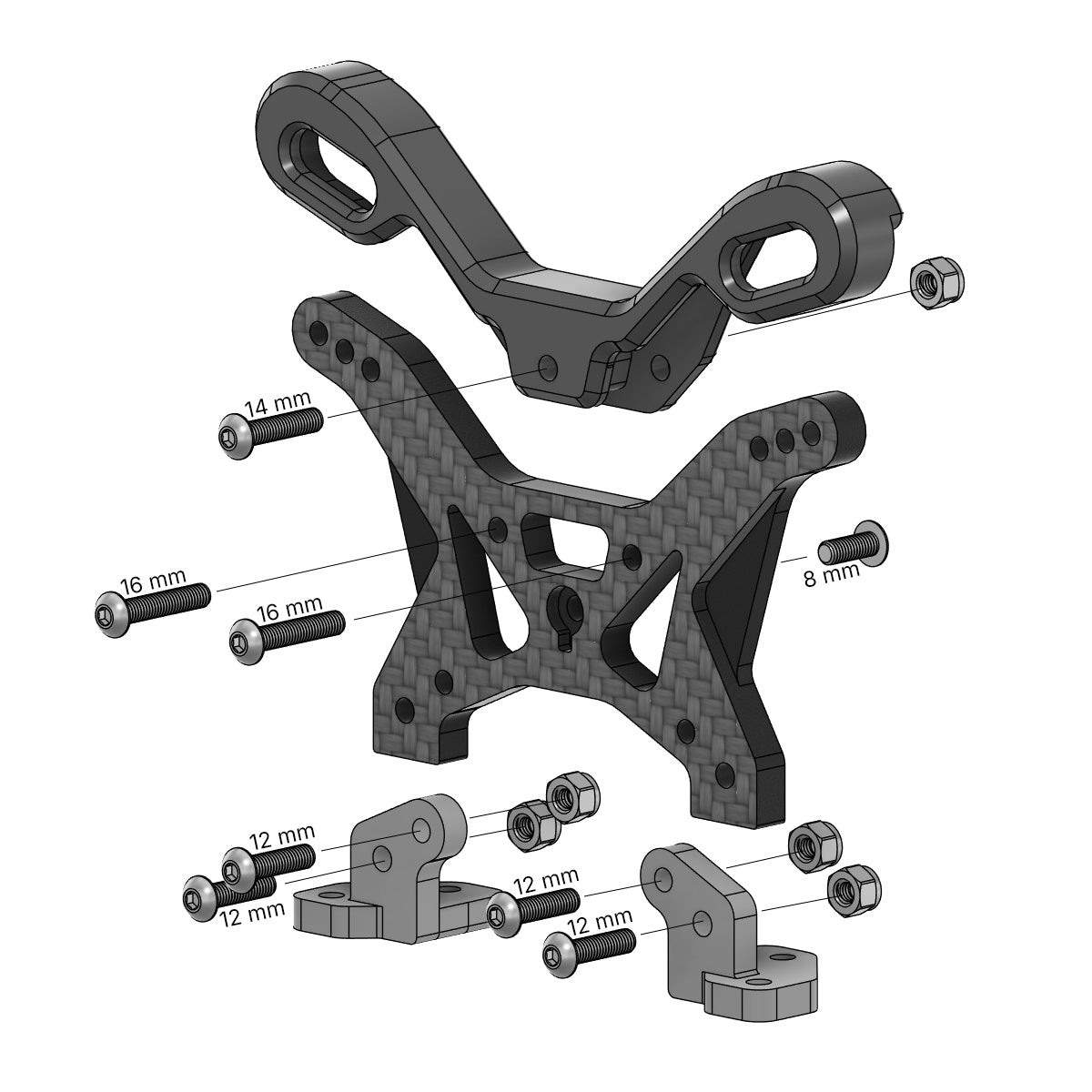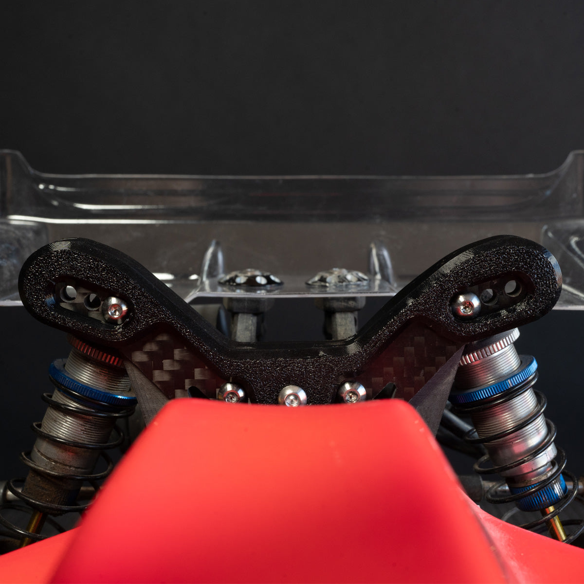 New 16 mm button head screws included for the wing mount and body mount (OEM uses flat heads for the molded plastic design). Shock tower cover fills the space between the carbon tower and the wing mounts.